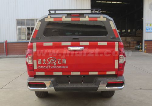 江特牌JDF5032TXFQC06/SH6型器材消防车采用上汽大通汽车有限公司生产的SH1030E6GD-P型轻型二类多用途货车底盘改装而成,该车最大的特点就是机动灵活、速度快、操控性好、驾驶舒适,越野性能强,可广泛应用于在丘陵、山地、凹地、河谷、森林等地带巡逻,及时发现火情,装运消防工具及器材。